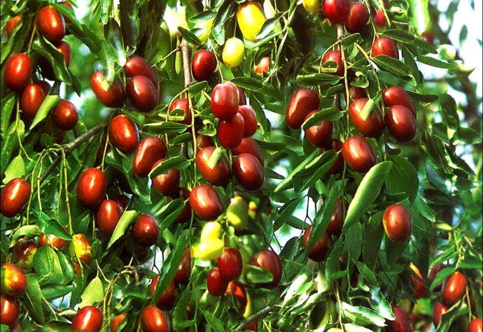 大枣:属于落叶灌木或小乔木,高可达10米。枝平滑无毛,具成对的针刺,直伸或钩曲, 幼枝纤弱而簇生,颇似羽状复叶。成“之”字形曲折。单叶互生;卵圆形至卵状披针形,少有卵形,长2~6厘米,先端短尖而钝,基部歪斜,边缘具细锯齿,3主脉自基部发出,侧脉明显。花小形,成短聚伞花序,丛生于叶腋,黄绿色;萼5裂,上部呈花瓣状,下部连成筒状,绿色;花瓣5;雄蕊5,与花瓣对生;子房2室,花柱突出于花盘中央,先端2裂,核果卵形至长圆形,长1.5~5厘米,熟时深红色,果肉味甜,核两端锐尖。花期4~5月。果期7~9月。红枣富含蛋白质、脂肪、糖类、胡萝卜素、B族维生素、维生素C、维生素P以及钙、磷、铁和环磷酸腺苷等营养成分。其中维生素C的含量在果品中名列前茅,有维生素王之美称。